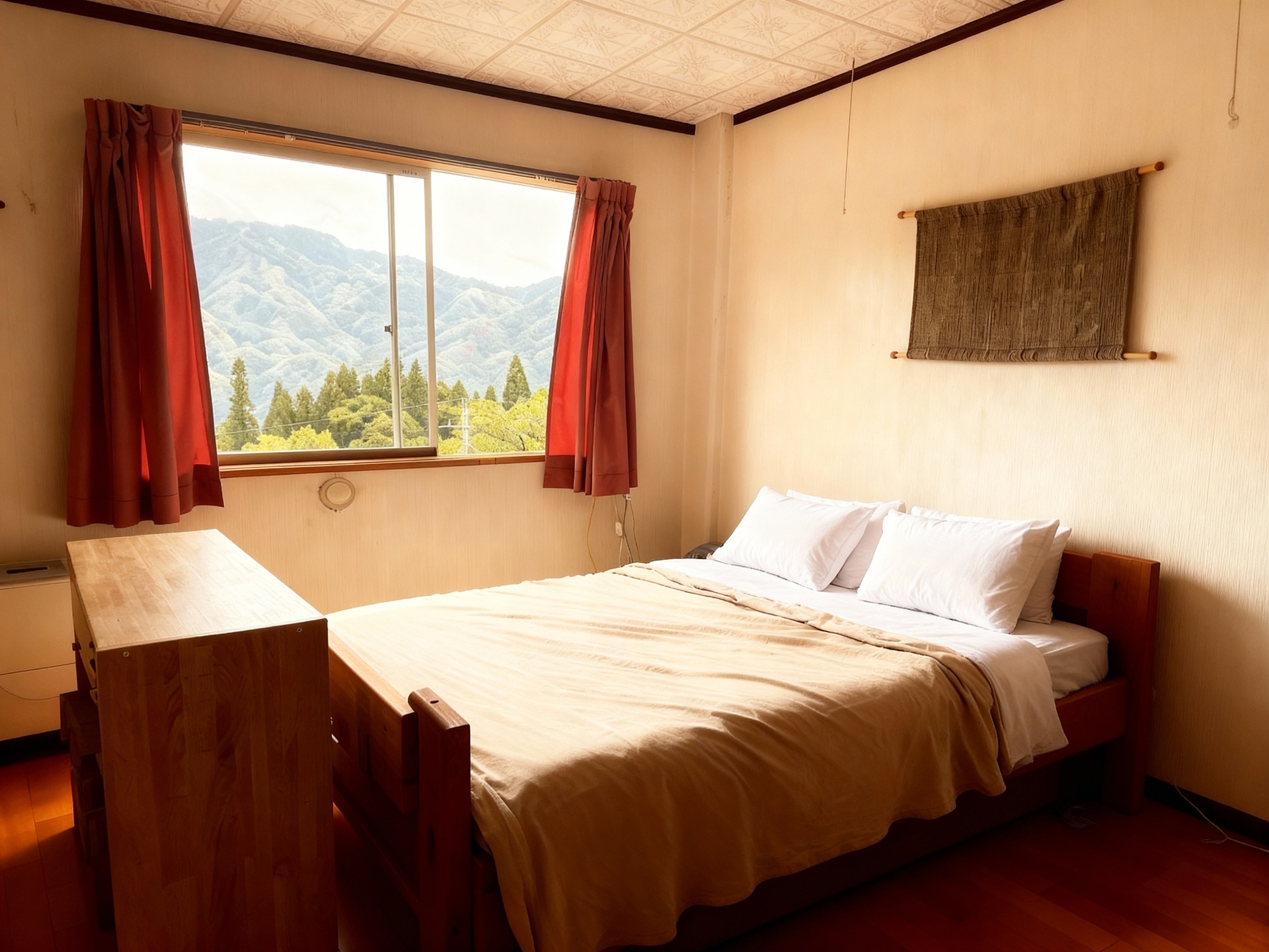 This Family Room features 1 queen western style bed and 2 single beds with toilet in room and Japanese style shared shower. It features clothes hanging rack/storage, heating and linen.